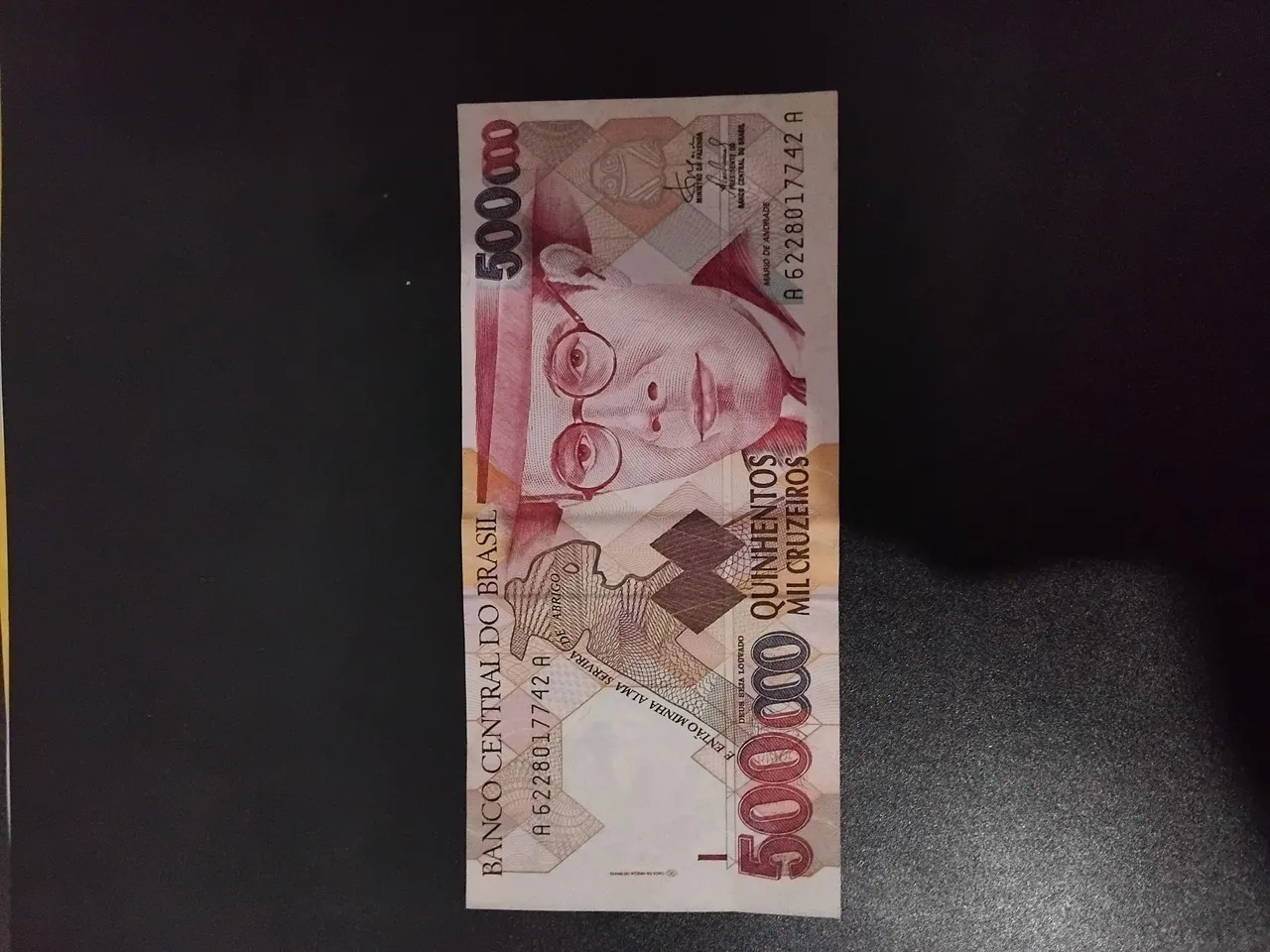 Cédula de quinhentos mil cruzeiros, uma peça rara e histórica para colecionadores. Uma peça autêntica do Banco Central do Brasil, perfeita para adicionar à sua coleção de antiguidades.