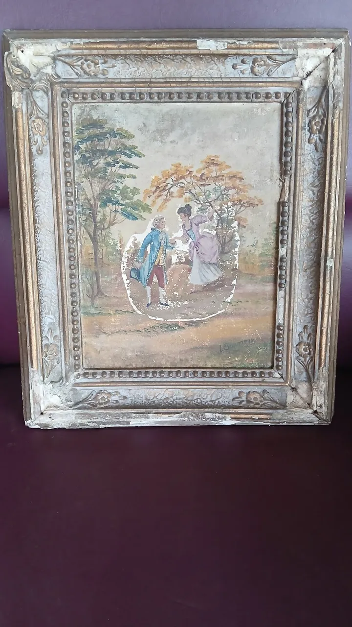 Linda pintura antiga emoldurada, retratando cena romântica em um jardim. Uma peça clássica para colecionadores e amantes de arte. Detalhes minuciosos e cores vibrantes que trazem elegância ao ambiente medidas 29 ×35 com moldura