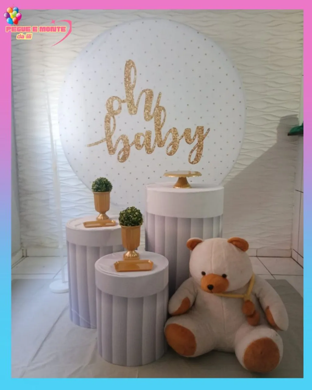 Linda decoração para o seu chá de bebê! Inclui painel, mesas e ursinho de pelúcia.