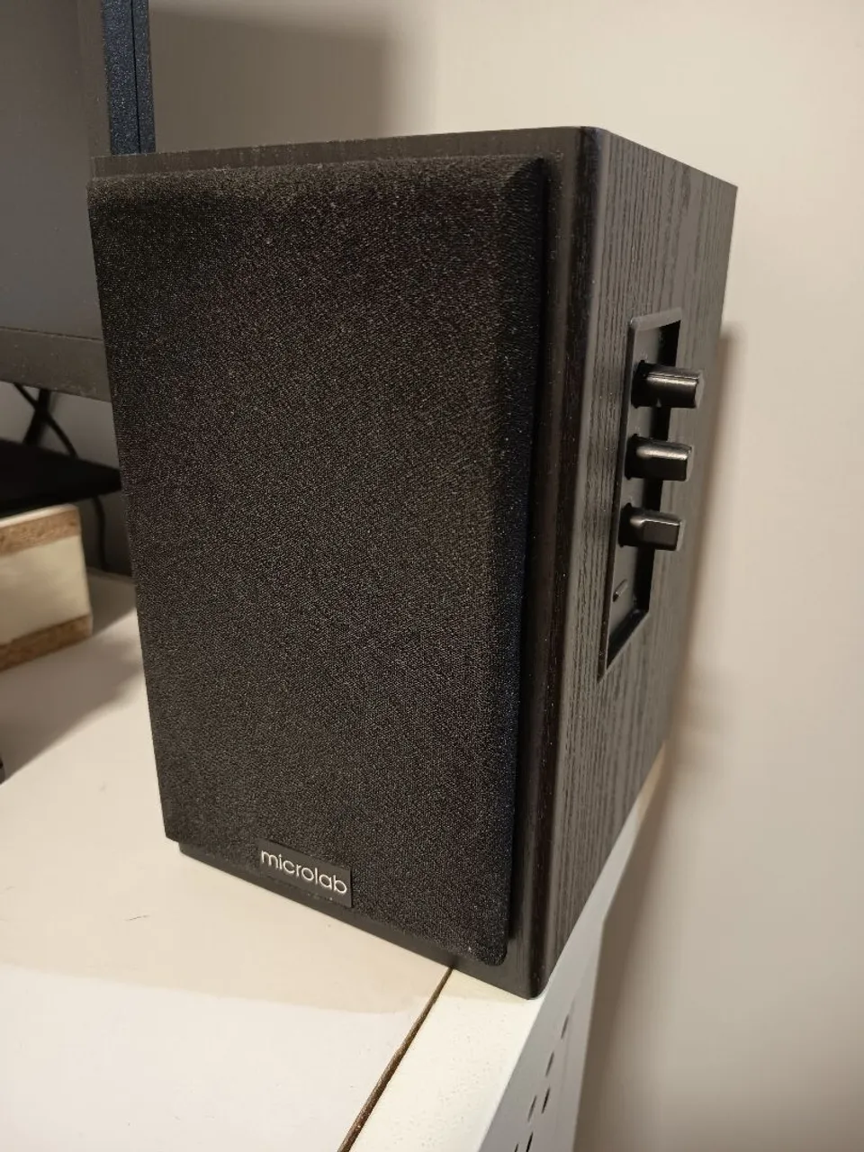 A Microlab B72 é um par de caixas de som 2.0 com potência total de 24W RMS (12W x 2), projetadas com estrutura em madeira para melhor acústica. Possui woofer de 4" e tweeter de 1" por caixa, resposta de frequência de 45Hz a 20kHz, blindagem magnética, entradas RCA e controles laterais de volume, graves e agudos.