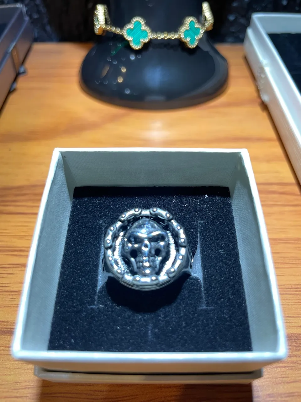 Anel de aço com design de caveira, perfeito para um visual estiloso e cheio de atitude. Um acessório que combina com diversos looks e ocasiões.