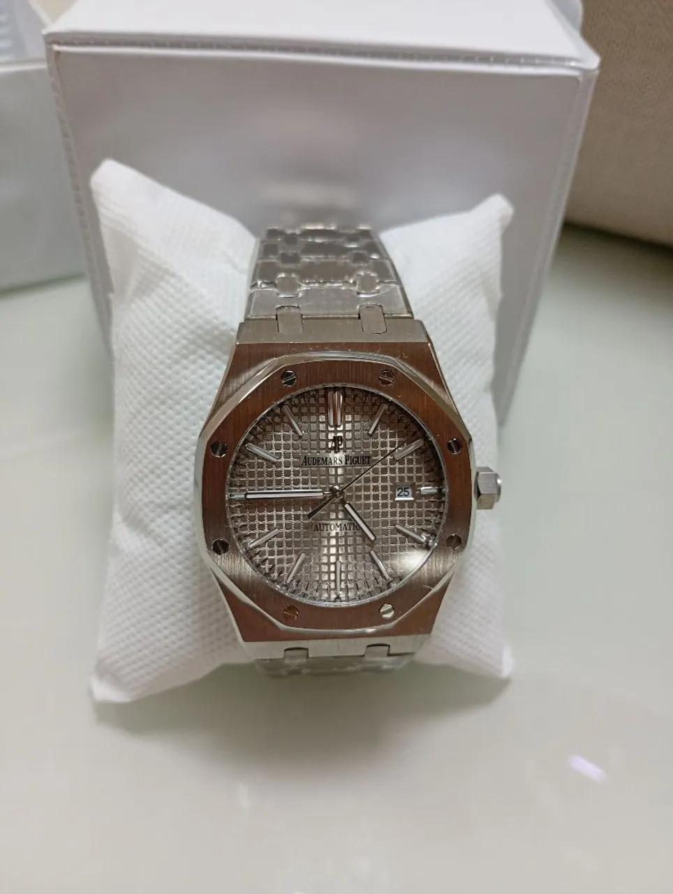 Relógio Audemars Piguet com design icônico e acabamento impecável. Um acessório de luxo que combina precisão e estilo, ideal para quem busca exclusividade e bom gosto. Detalhes refinados e movimento automático.