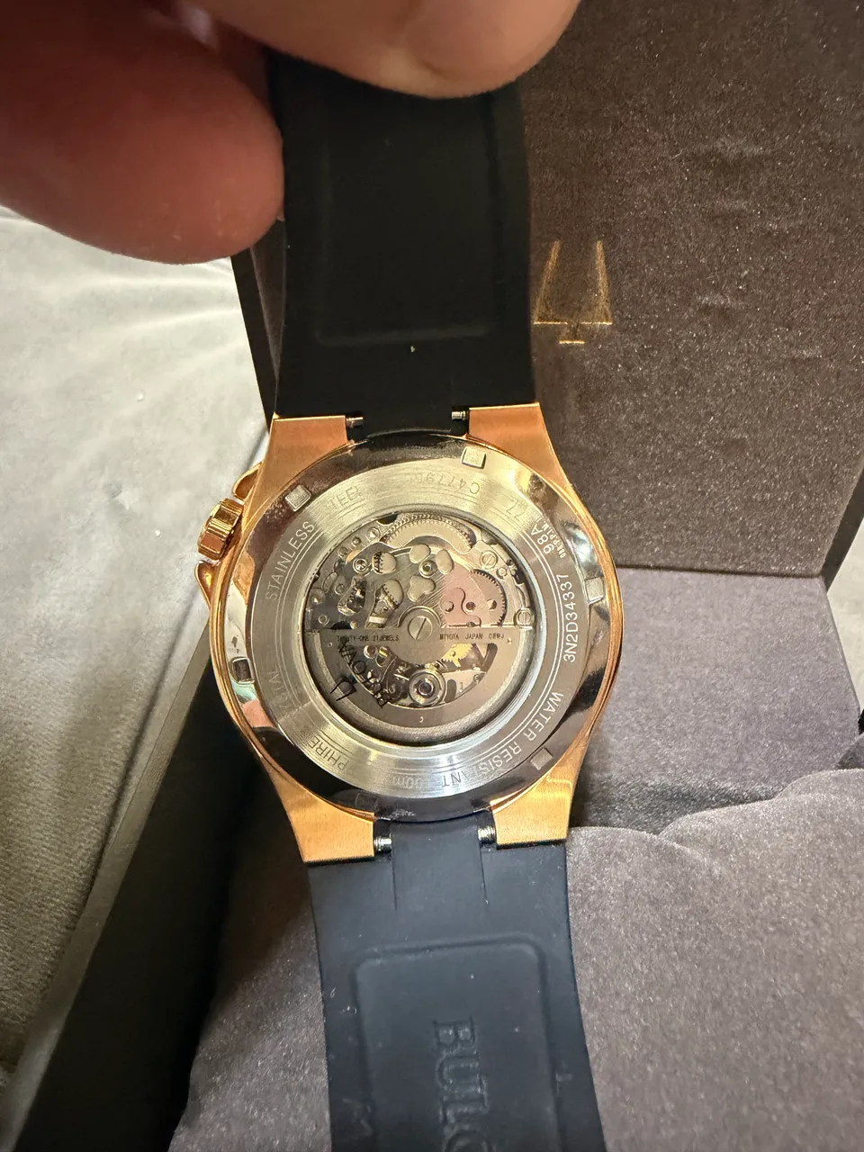 Marca: Bulova Linha: Classic Tipo: Automático (mecânico) Movimento: Automático japonês Jóias: 21 jewels (aparece no mostrador) Mostrador: Skeleton (mecanismo aparente) Caixa: Aço inox com acabamento rose gold Formato da caixa: Redonda Diâmetro da caixa: ~42 mm Espessura: ~12 mm Vidro: Cristal mineral Pulseira: Borracha / silicone preta Fecho: Fivela tradicional Fundo: Transparente (exibe o movimento) Resistência à água: 30 metros (3 ATM - respingos apenas) Reserva de marcha: Aproximadamente 40 horas