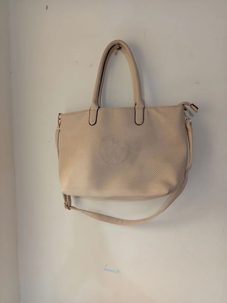 Linda bolsa de ombro bege com detalhes perfurados, ideal para qualquer ocasião. Design moderno e elegante.