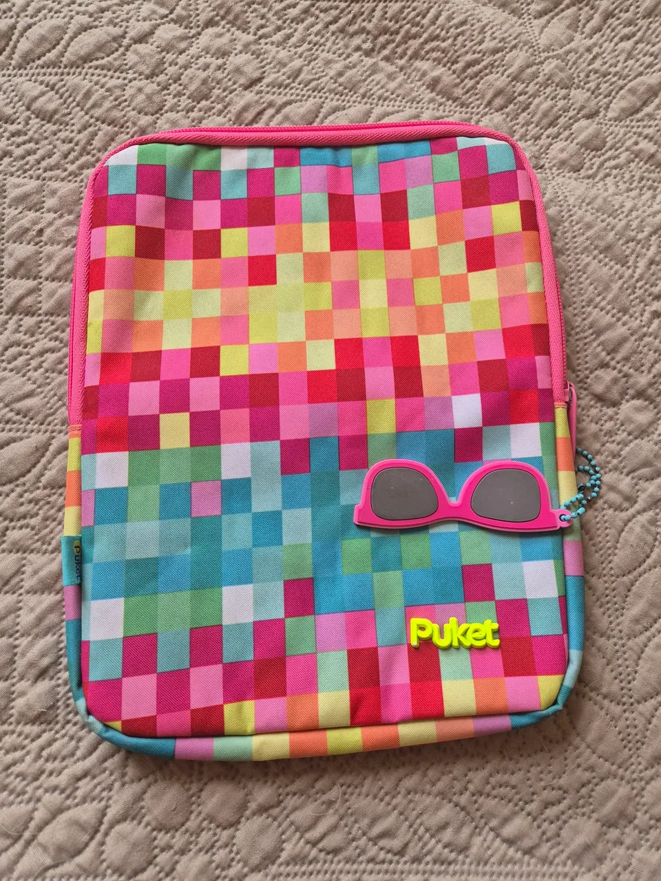 Linda vapa para tablet Puket, com design vibrante e divertido. Também pode ser utilizada como necessaire para guardar outros pertences.