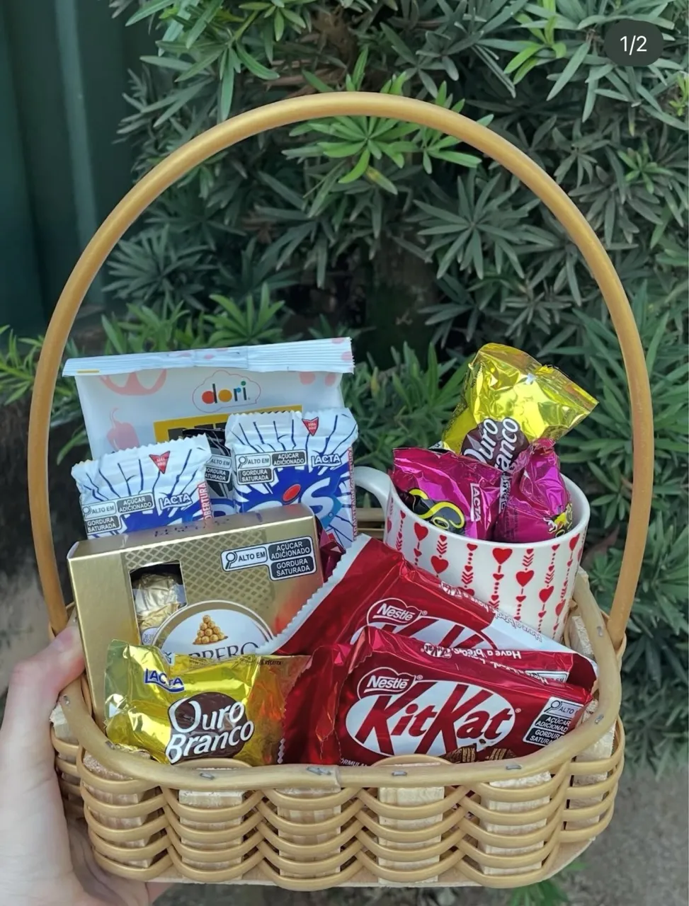 Uma cesta repleta de delícias para presentear ou saborear! Com chocolates variados e um toque especial, a cesta é perfeita para qualquer ocasião. Ideal para quem ama um bom chocolate!