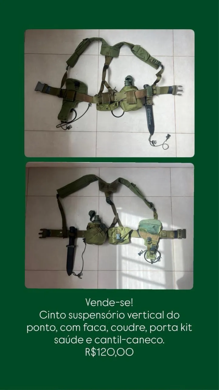 Cinto suspensório vertical completo, ideal para quem busca praticidade e organização no trabalho. Acompanha faca, cantil, porta kit saúde e cantil-caneco, tudo em um só lugar!