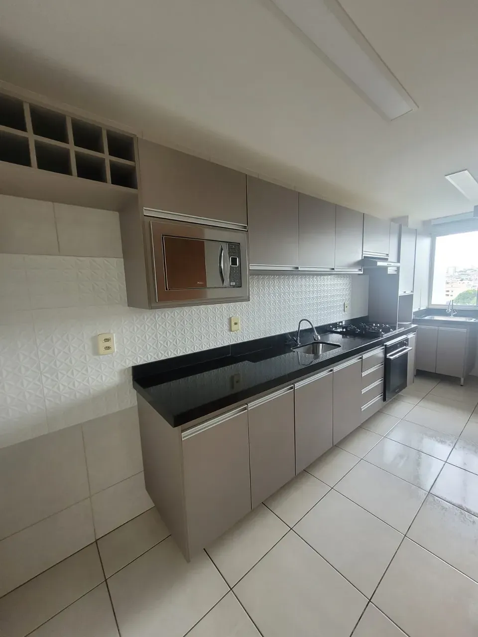 Cozinha com armários planejados, revestimento em cerâmica 3D e equipada com fogão, forno, sugar e micro-ondas;