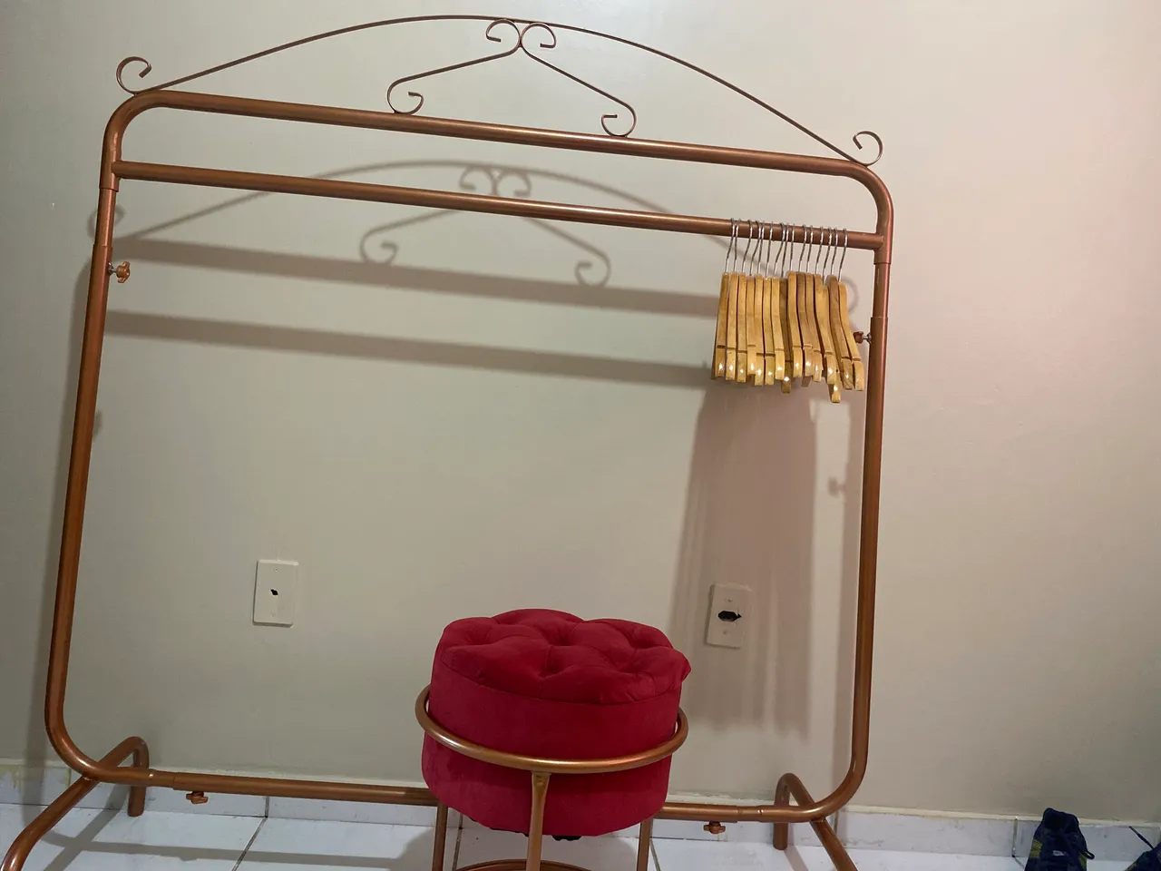 Conjunto perfeito para o seu quarto ou closet! Arara de roupa elegante em tom cobre, acompanhada de um charmoso puff vermelho. Organize suas roupas com estilo e adicione um toque de sofisticação ao ambiente e 15 cabides de madeira super elegante para seu cantinho de fotos ou guardar suas roupas. Cabides 5 reais cada, Puff 100, arara 150. Tudo novo sem uso. Vendendo pela metade do preço que paguei pois não irei fazer o projeto que pretendia e eles ficaram sem utilidade para mim. Buscar em Valparaiso. Passo cartão.