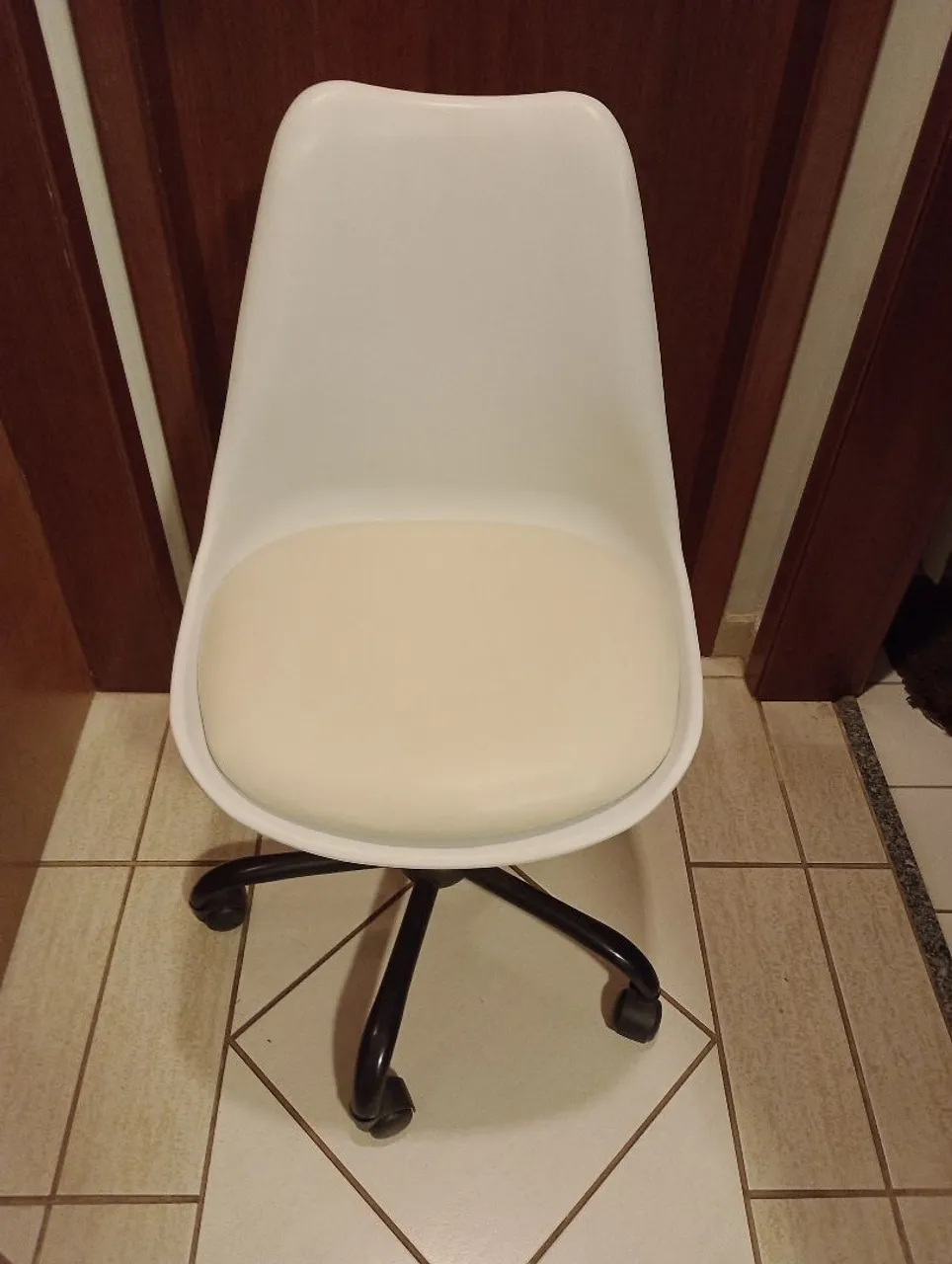 Cadeira com design moderno e confortável, ideal para diversos ambientes. Possui rodinhas para facilitar a movimentação e assento estofado, garantindo conforto e praticidade.