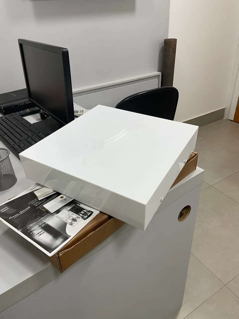 02 luminárias pendentes, em acrílico leitoso, para 04 lâmpadas. Usadas, porém em perfeito estado de conservação. Cada uma mede 34,5cm X 34,5cm.