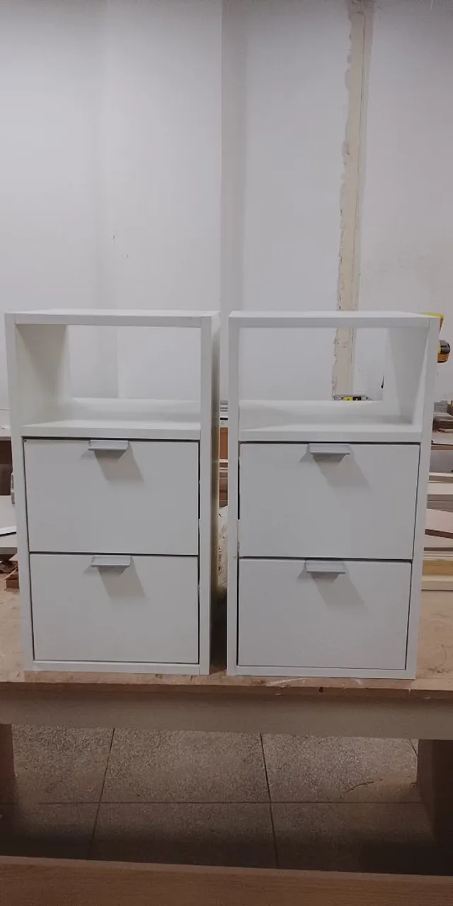 Conjunto de criados mudos brancos, ideais para o seu quarto. Design moderno e funcional, com duas gavetas espaçosas para organizar seus pertences. Perfeitos para complementar a decoração do seu ambiente.