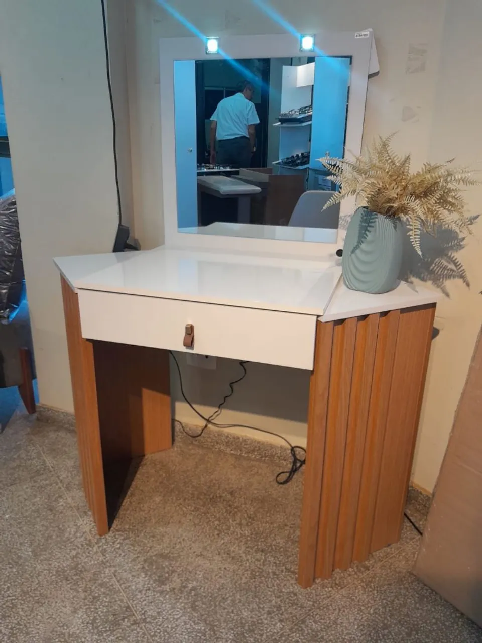 Linda penteadeira com design moderno, espelho com iluminação e detalhes em madeira. Ideal para organizar maquiagens e produtos de beleza.