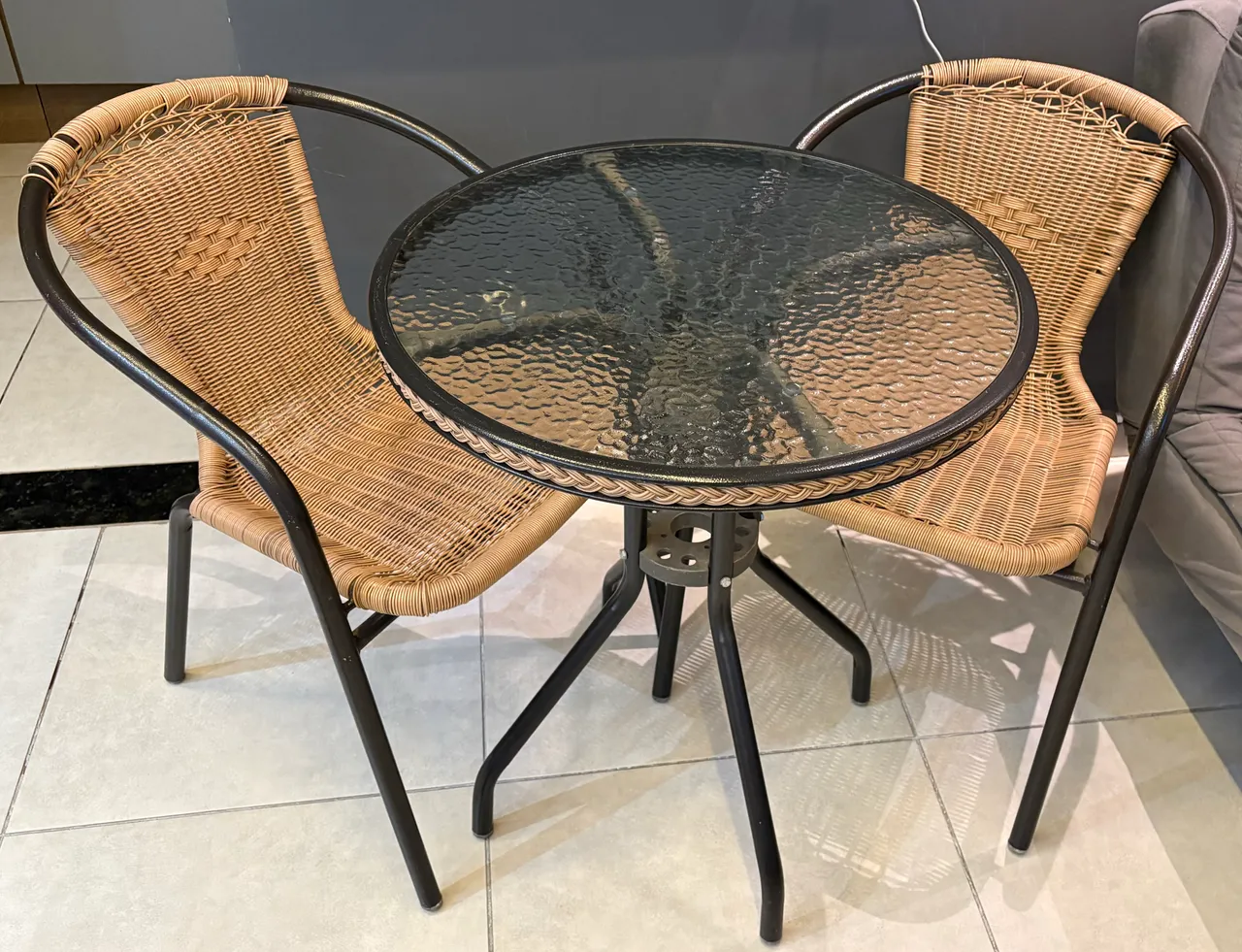 Vendo mesa redonda com tampo de vidro texturizado + 2 cadeiras em fibra sintética com estrutura em metal resistente.