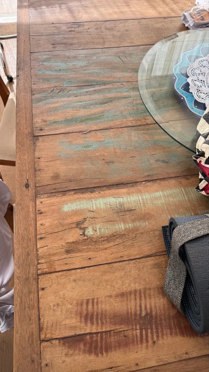 Linda mesa de madeira com design rústico e detalhes em cores vibrantes, perfeita para dar um toque especial à sua casa.