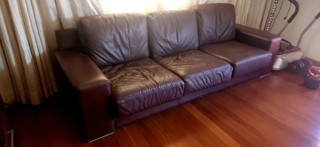 Sofá de couro marrom com design elegante e confortável, ideal para sua sala. Perfeito para relaxar e receber visitas. Com design moderno, adiciona charme a qualquer ambiente.